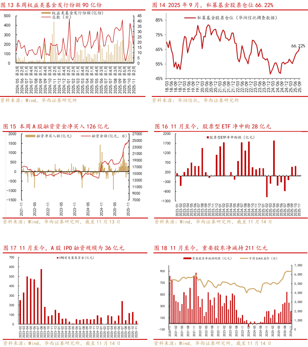一、海外方面,美联储释放鹰派信号使得市场降息预期回摆,全球风险偏好回落,美国股债汇承压。本周美国持续43天的政府停摆结束,但美国股债汇市场均承压,源于经济数据的空窗促使多位美联储官员向鹰派转向:克利夫兰联储主席哈马克表示美联储应维持利率稳定,以继续对高通胀施压;圣路易斯联储主席穆萨勒姆认为政策仍需保持一定的限制性;明尼阿波利斯联储主席卡什卡里表示当前通胀“仍然偏高”。CME美联储观察显示,市场定价12月降息25个基点的概率降至五成。下周起美国多项9月经济数据将陆续发布,但10月通胀和就业数据可能“永远不会公布”,这也将使得美联储对12月降息的分歧加大。