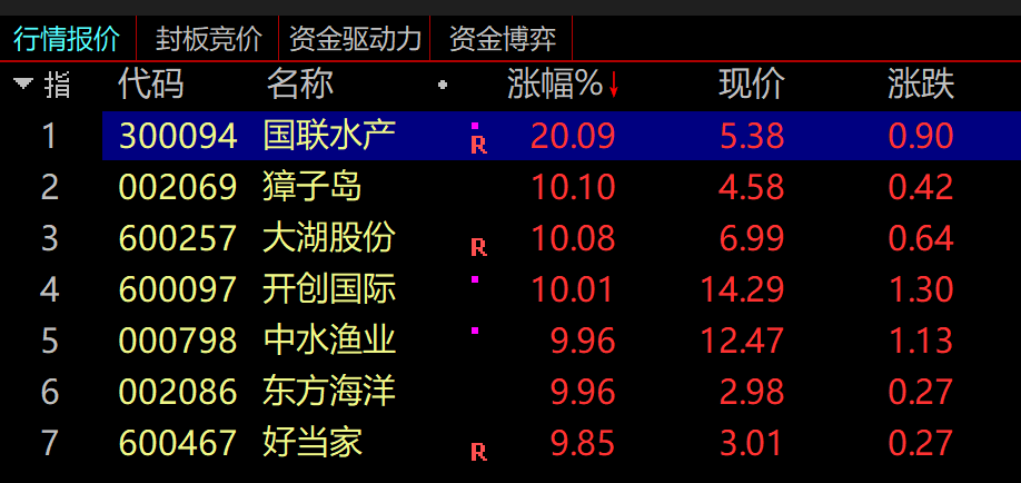 周三,A股上演罕见一幕,水产养殖板块集体涨停,根据交易所数据,国联水产午后20cm直线涨停,獐子岛、大湖股份、开创国际、中水渔业、东方海洋、好当家等全部涨停。
