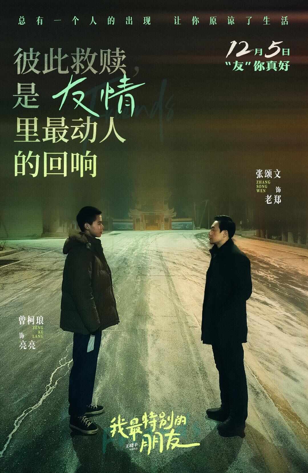 由王晓丰导演及编剧,张颂文、曾柯琅领衔主演的电影《我最特别的朋友》于今日发布友情版预告。影片此前已官宣将于12月5日全国上映。此次预告褪去之前的冲突感,以温暖细腻的笔触聚焦老郑(张颂文 饰)与亮亮(曾柯琅 饰)的跨代温馨友情,将两个孤独灵魂相互靠近的过程娓娓道来。,预告中,亮亮局促地向老郑开口,诉说着自己当下的困境。 老郑随口的反问,却换来亮亮一句轻得像叹息的回应:“我没家了。” 简短对话没有煽情,却成为两人缔结羁绊的重要转折点。,