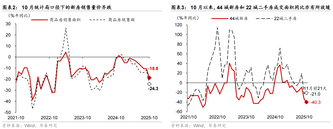 另一方面,地产去杠杆对信用周期和企业现金流的冲击在边际缓解,去杠杆周期进入阶段性“收尾”阶段,今年1-10月虽然新房销售面积累计同比下降5.6%,但22城二手房成交量累计同比增长约10%,显示成交量或有所企稳,而三季度以来的房价下行或有望推动稳地产相关政策预期升温。此外,随着高基数叠加国补退坡的影响显现,服务消费也有望得到更多政策倾斜,对消费增长形成一定托举。