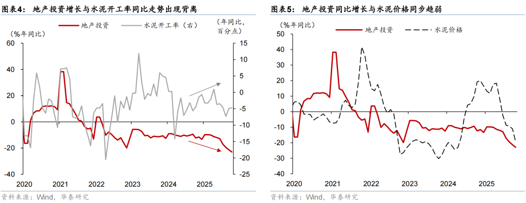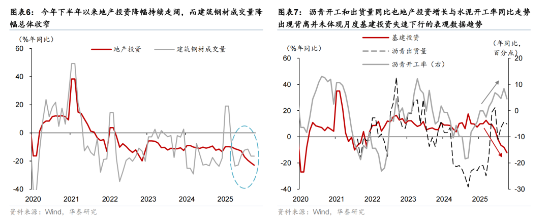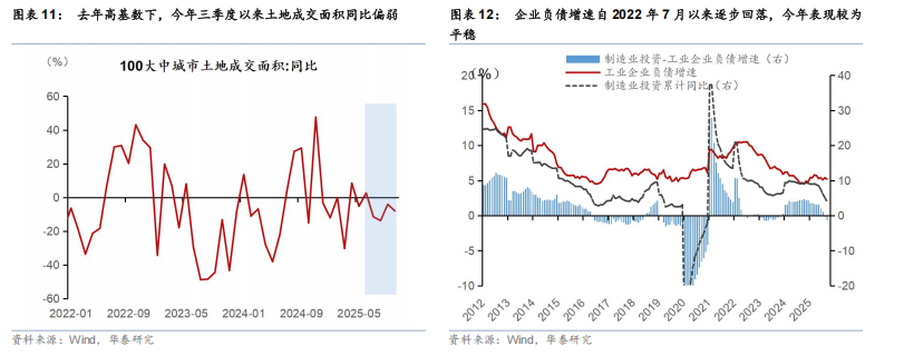 固定资产投资完成额等指标的统计口径等变化因素。虽然近期建筑和开工相关指标走势较平淡,但并未体现月度固定资产投资大幅下滑的表观数据趋势。不排除月报固定资产投资或部分受统计口径差异及项目填报周期影响,读数放大实际波动。①固定资产投资完成额统计口径包括土地购置费,下半年土地成交面积同比回落或形成拖累;② “反内卷”政策推进对地方政府补贴行为形成约束,或拉长基建、制造业投资等申报周期,亦可能影响投资额确认节奏,从而拖累当期投资读数。