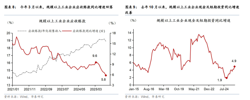 工业企业数据层面,今年9月规模以上工业企业盈利/营收同比较8月的20.4%/2.3%进一步回升至21.6%/3.1%(图表20)。尤其是工业企业现金及短期投资同比较7月的4.2%小幅上行至8月的4.9%,应收账款同比增速亦持续回落,可能显示出强出口及“反内卷”政策推动企业现金流改善(参见《强出口+反内卷推动企业现金流改善》,2025/10/27)。
