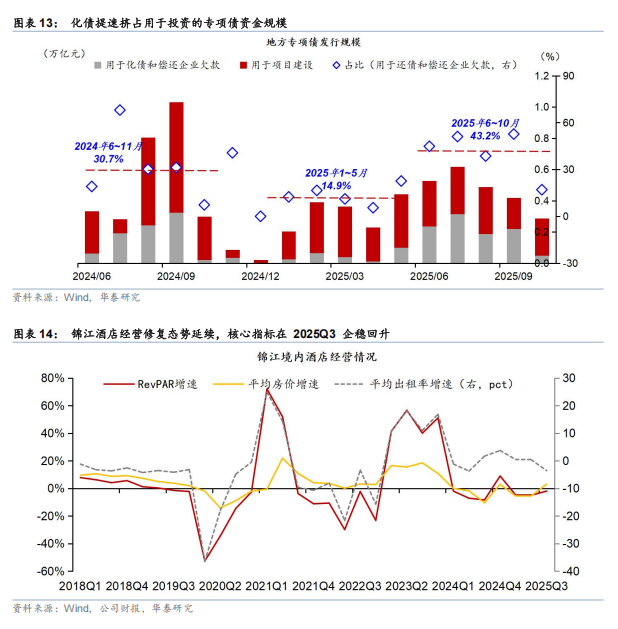 2)固定资产投资完成额的数据部分基于项目会计报表及支付凭证进行汇总,“反内卷”政策推进对地方政府补贴等行为形成约束,或拉长基建、制造业投资等申报周期,亦可能影响投资额确认节奏,从而拖累当期投资读数。此外,下半年以来专项债中用于化债的比例提升,或部分带来实际用于项目投资相关的资金同比回落(图表13)。