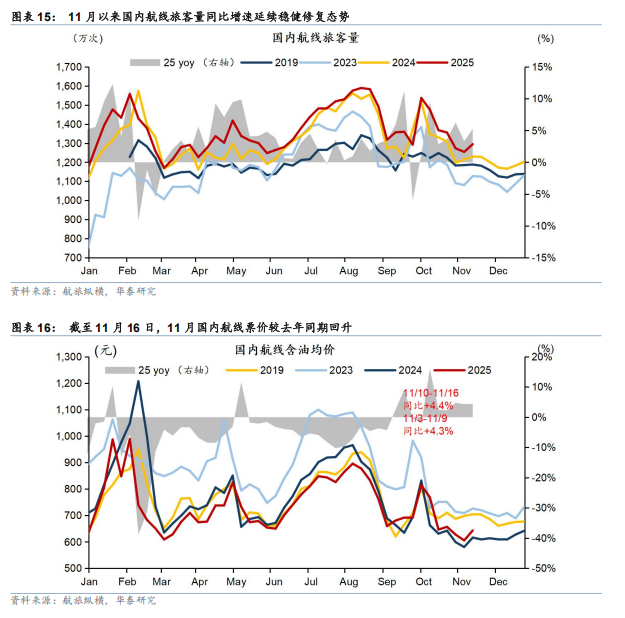 非补贴类的服务型与体验型消费保持相对稳健——11 月虽处淡季,但酒店及商务出行需求亦呈现边际企稳,比如锦江境内酒店 2025第三季度平均房价与出租率增速维持在正区间,RevPAR 降幅收窄,航空需求在传统淡季保持稳定,11月10-16日,国内航线机票均价(含油)同比回升4.4%,旅客量亦同比企稳回升,11月10-16日国内航线旅客量同比增速回升至5.3%(图表13-15),或部分受益于商务出行改善。