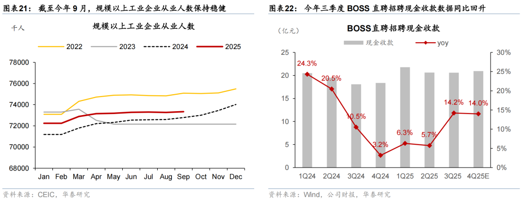总体而言,去除特殊扰动后,地产外的投资和消费走势可能仍然趋于平稳。价格变化作为衡量供需边际变化的最敏感指标,显示环比总需求走势趋于平稳——10月PPI环比年内首次回升至0以上,“反内卷”政策推动以来部分行业供需结构改善,动力煤价格自7月以来持续上行,多晶硅价格亦维持在较高水平,螺纹钢及水泥价格环比降幅趋缓,化工品价格或仍在筑底(图表17-18);同时,3季度的工业企业收入、利润、就业等指标亦边际企稳——截至今年9月数据,规模以上工业企业库存同比增速边际抬升,低基数下亦推升企业营收及利润增速明显上行,此外,规模以上工业企业就业人数保持平稳,BOSS直聘招聘现金收款同比增速在三季度改善、预计四季度保持稳健(图表21-22)。运价、港口吞吐量等高频指标亦显示11月出口增速或边际回升。