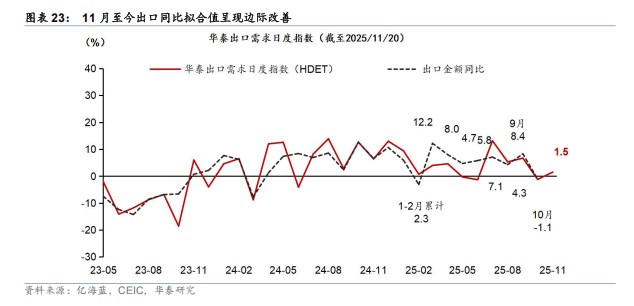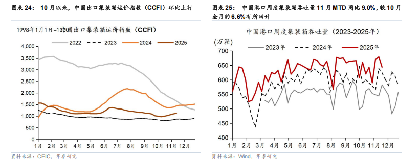 出口高频指标层面,港口高频指标及运价均显示11月至今出口或呈现边际改善。11月1-20日出口需求日度指数HDET显示同比录得1.5%,高基数下较10月的-1.1%呈现修复(图表23)。11月1-16日,中国港口周度集装箱吞吐量同比增长9.0%,较10月的6.6%亦小幅上行。中国出口集装箱运价综合指数(CCFI)与东南亚集装箱运价指数(SEAFI)11月以来连续三周持续环比上涨(图表24-25),此外,韩国11月前20日出口同比较10月全月的3.6%回升至8.2%,经工作日差异调整后,韩国11月前20日出口额同比增速亦由10月全月的14%小幅回落至8.2%,半导体/乘用车/船舶出口比增长26.5%/22.9%/2.3%,对出口的拉动作用明显。