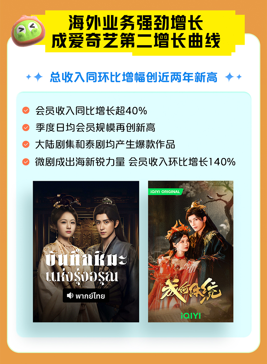 海外业务的高速增长得益于“精品内容输出+本土化运营”的双轮驱动。内容方面,爱奇艺精准把握海外用户偏好,古装剧与现代偶像剧双线破圈:越南语配音版《书卷一梦》开播首日创同语种配音内容单日收入新高;《朝雪录》登顶爱奇艺国际版13个市场的热播榜;恋恋剧场《爱你》以“中医治愈”题材在泰国、韩国、印尼等国引发热议,成为华语现偶剧出海标杆。本土化内容制作同样表现出色,泰语剧集《灵魂重生》成为2025年现象级作品,会员收入创下爱奇艺国际版泰剧纪录,并登顶谷歌和推特(X)相关榜单。