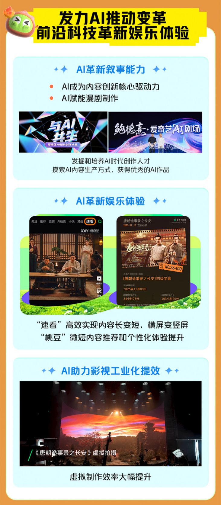 从B端全流程生产赋能到C端消费体验优化,从单点工具创新到生态系统构建,爱奇艺正推动AI从辅助工具演变为新型内容生产力,并以行业共建姿态,树立影视产业AIGC生态建设的新标杆。
