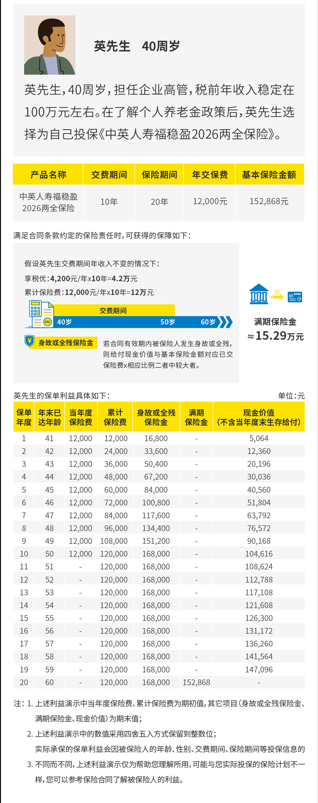在规划个人养老金时,除了要用好税收优惠,我们还应关注个人养老金账户内资金的长期稳定性和增长空间。在国家规定的、纳入个人养老金目录的金融产品中,选择像【中英人寿福稳盈2026两全保险】这类商业养老保险产品,不仅能享受每年的税收优惠,更可以为自己构建一份稳定安心的养老储备。购买商业养老保险主要有两大优势,以【中英人寿福稳盈2026两全保险】为例: