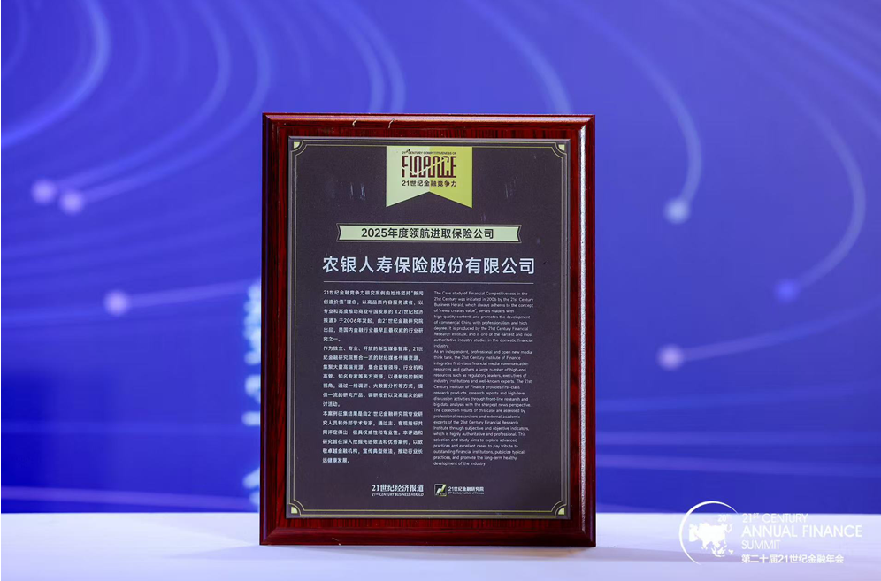 11月22日,在《21世纪经济报道》主办的“第二十届21世纪金融年会”上,2025年21世纪金融竞争力研究案例正式公布。经由专业研究人员和外部学术专家共同评定,农银人寿凭借稳健的发展理念、优秀的发展业绩与卓越的服务品质,荣获“2025年度领航进取保险公司”奖项。