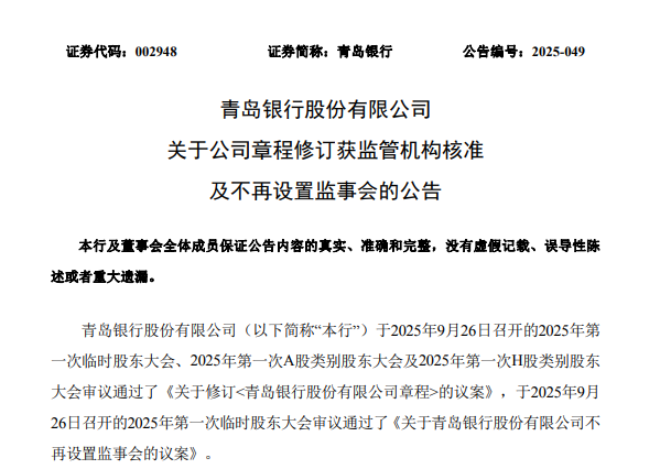 青岛银行在公告中表示,近日,该行收到《国家金融监督管理总局青岛监管局关于青岛银行修改公司章程的批复》(青金复〔2025〕278号),本次修订后的《青岛银行股份有限公司章程》(以下简称“《公司章程》”)已获核准。自本次修订后的《公司章程》获核准之日起,该行“董事会战略委员会”更名为“董事会战略和可持续发展委员会”。自本次修订后的《公司章程》获核准之日起,该行不再设置监事会,由董事会审计委员会行使相关法律法规等规范性文件规定的监事会职权,监事会下设专门委员会同步撤销,该行监事会相关制度相应废止。何良军先生、王大为先生、刘文佳女士、姜省路先生、卢昆先生不再担任该行监事及监事会相关职务,并确认其与该行董事会、监事会无意见分歧,亦无有关其卸任须提请本行股东及债权人注意的其他事项。截至本公告之日,上述监事未持有该行股份,不存在未履行完毕的公开承诺。