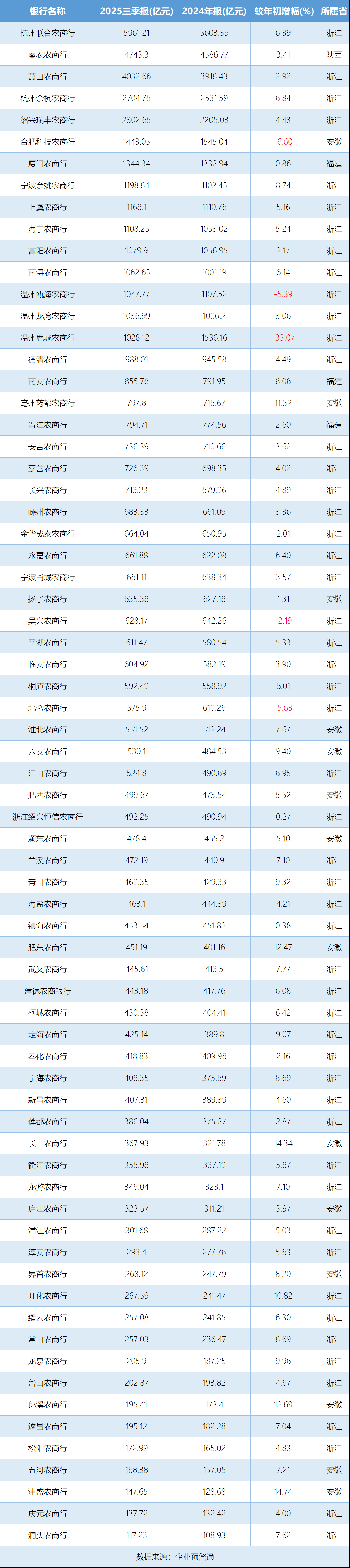 增长表现上则呈现出分化特点:增速领跑的是芜湖津盛农商行,与年初相比增速达到14.74%;安徽长丰农商行增速也达14.34%,亳州药都、安徽肥东、开化农商行等的增速同样超过10%,成为增长梯队里的亮点。不过,也有5家农商行出现了资产规模的负增长,包括合肥科技农商行、浙江温州瓯海农商行、浙江温州鹿城农商行、湖州吴兴农商行、宁波北仑农商行,均出现不同程度的收缩,其中浙江温州鹿城农商行的降幅最为明显,达到33.07%。