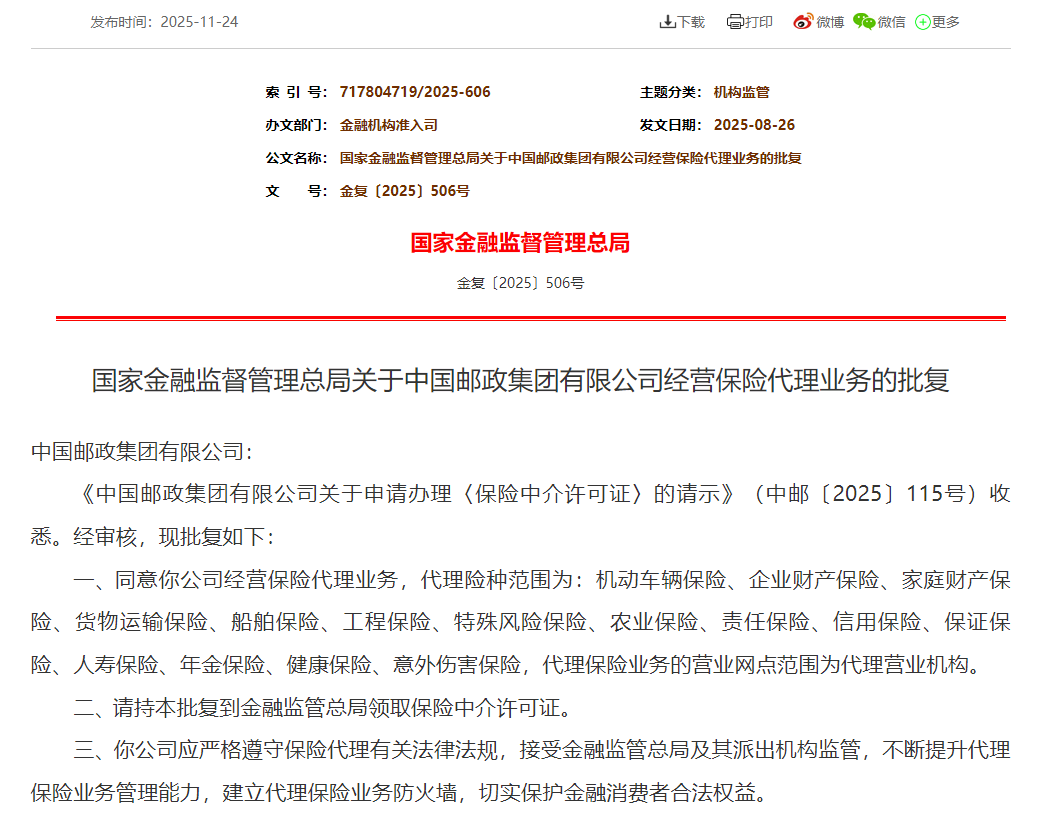 2025年11月24日,金融监管总局给中国邮政集团发了一张特殊的保险代理牌照 —— 这是该局成立以来首张直接批复的兼业保险代理牌照,也是两年来唯一一张‘重量级’中介资质。
