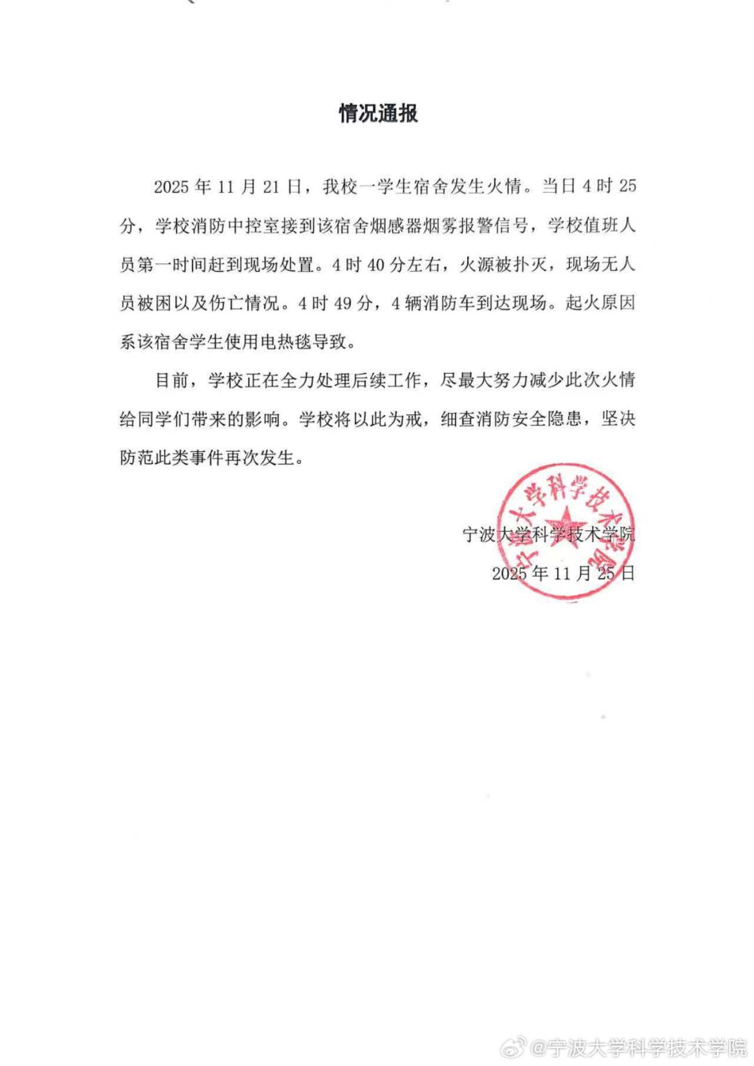 11月25日,宁波大学科学技术学院发布情况通报:,11月21日,一学生宿舍发生火情。当日4时25分,学校消防中控室接到该宿舍烟感器烟雾报警信号,学校值班人员第一时间赶到现场处置。4时40分左右,火源被扑灭,现场无人员被困以及伤亡情况。4时49分,4辆消防车到达现场。起火原因系该宿舍学生使用电热毯导致。,目前,学校正在全力处理后续工作,尽最大努力减少此次火情给同学们带来的影响。学校将以此为戒,细查消防安全隐患,坚决防范此类事件再次发生。,