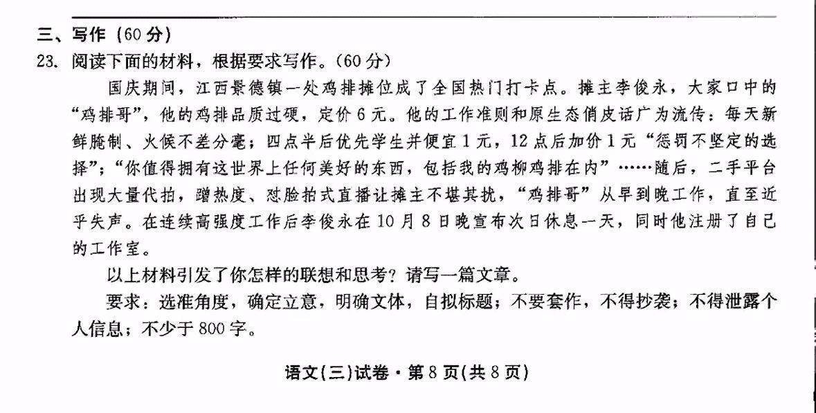 ,11月24日,景德镇市教育体育局工作人员告诉记者,“这是初中试卷,学生比较能接受一些新颖活泼的事情,同时‘鸡排哥’也是我们这边的文旅推荐官,所以命题人员把他加进去了。”,同日,记者从“鸡排哥”妹妹处获悉,“鸡排哥”本人已经知晓自己被写入试卷一事。,在评论区,不少IP地址为江西的网友纷纷表示,自己也做过这份试卷。“当时做这张试卷给我笑喷了,结果地理考了29分。”也有外地网友感叹出卷老师“网速太快”,“这个(出卷老师)网速比我们学校老师还快。”