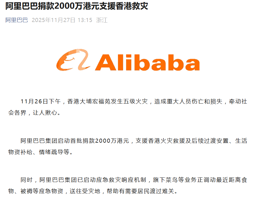11月26日下午,香港大埔宏福苑发生五级火灾,造成重大人员伤亡和损失,牵动社会各界,让人揪心。27日午后,阿里巴巴集团官微宣布启动首批捐款2000万港元,支援香港火灾救援及后续过渡安置、生活物资补给、情绪疏导等。