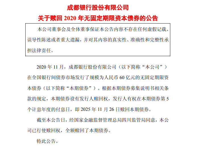 日前,成都银行发布公告表示,2020年11月,该行在全国银行间债券市场发行了规模为人民币60亿元的无固定期限资本债券(以下简称“本期债券”)。