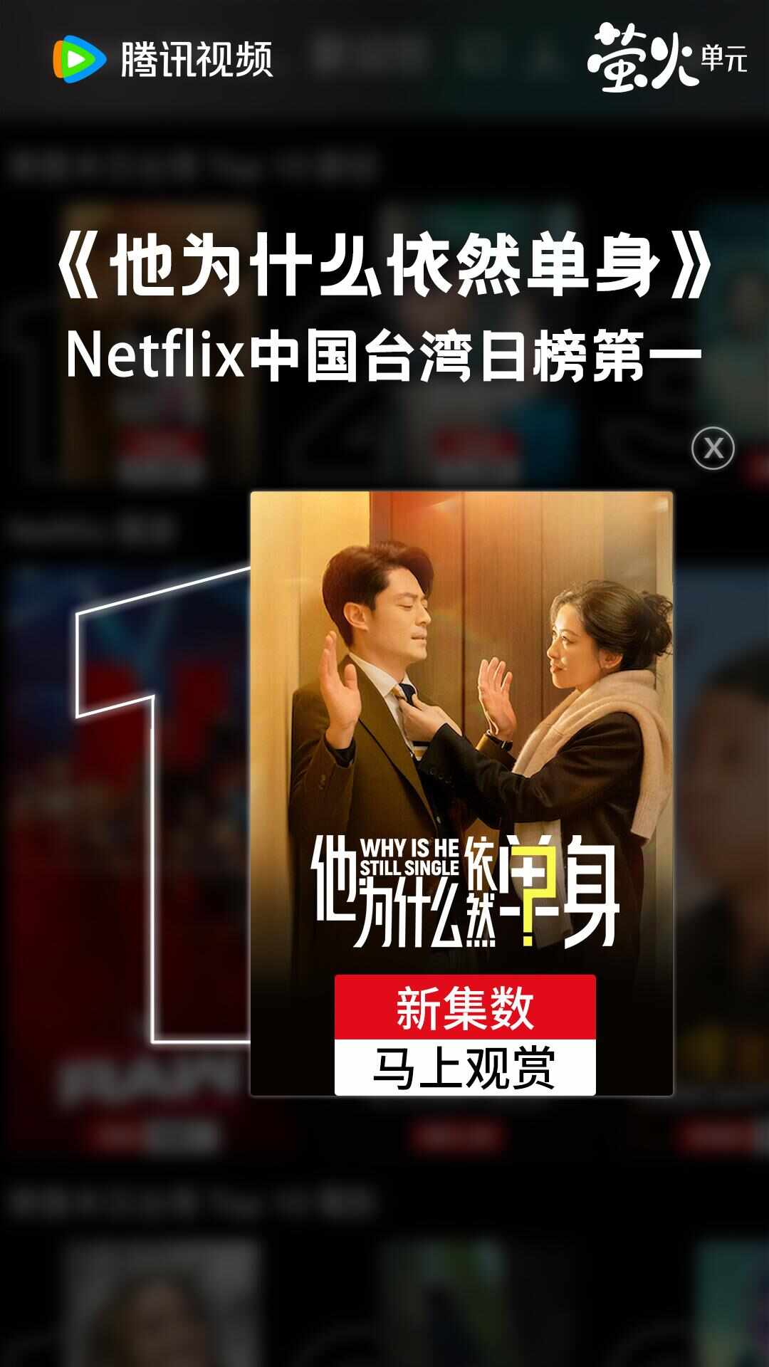 ,目前Netflix网站数据显示,《他为什么依然单身》在11月26日会员收官日登顶Netflix中国台湾地区日榜第一。该剧在大陆及台湾地区播出以来,以轻喜解压又下饭的剧集风格广受好评,在社媒平台掀起了一场关于单身现象本质的深刻讨论,也映照出这个时代人们对于幸福与自我价值的全新认知与深度觉醒。,文|记者 龚卫锋,图|腾讯视频,《他为什么依然单身》由郄国伟执导,步晓峰、桂东鸣、董元欣编剧,霍建华、朱珠领衔主演,腾讯视频、萌扬文化、兄弟映画、北京电视艺术中心有限公司联合出品。