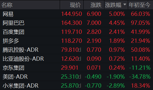 在全球市场调整之际,中国资产却成为一抹亮色。纳斯达克中国金龙指数逆势上涨0.87%,万得中概科技龙头指数涨1.61%。个股方面,网易涨约5%,阿里巴巴涨超4%,百度涨2.41%,拼多多涨1.89%,京东涨0.20%。新茶饮品牌霸王茶姬表现抢眼,单日涨幅超6%。不过,蔚来汽车跌超5%,爱奇艺、金山云跌逾4%。