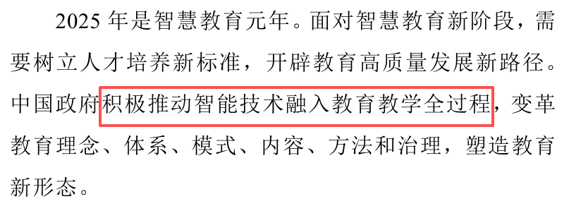 教育部发布的《中国智慧教育白皮书》将2025年定义为智慧教育元年,并指出人工智能正全方位改变教育内容、教学模式、教育治理和教育形态。