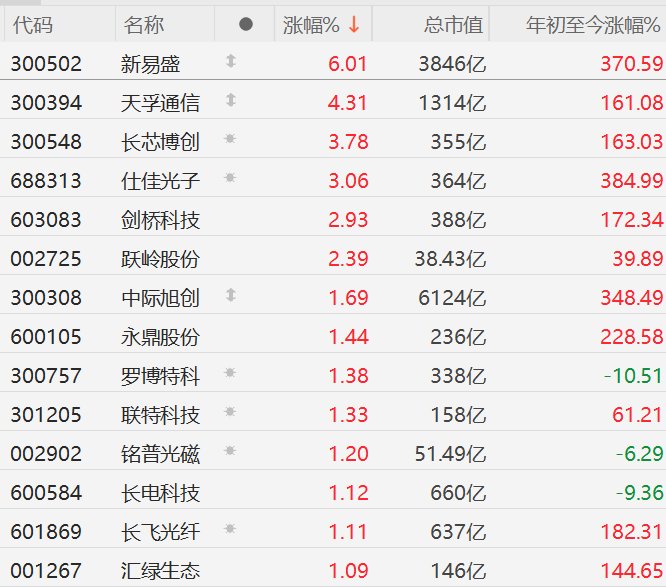 CPO概念股普涨,新易盛涨6%上淘有品管理员27天前发布关注私信00 12月3日,A股市场CPO概念股普涨,其中,新易盛涨6%,天孚通信涨超4%,长芯博创、仕佳光子涨超3%,剑桥科技、跃岭股份涨超2%。 股票频道更多独家策划、专家专栏,免费查阅>> 责任编辑:栎树 © 版权声明文章版权归作者所有,未经允许请勿转载。THE END 喜欢就支持一下吧点赞0 分享QQ空间微博QQ好友海报分享复制链接收藏