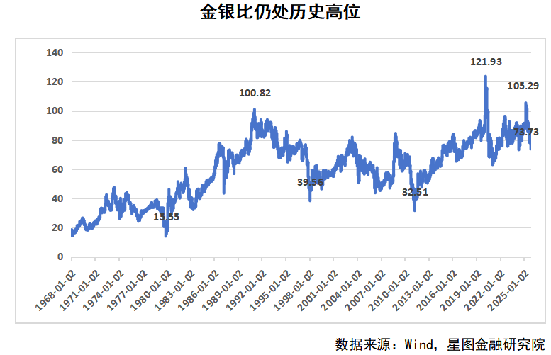 第二,白银估值具备相对性价比。同为贵金属,白银和黄金的各种属性高度相似,因此市场常用“金银比”(即一盎司黄金与一盎司白银的价格之比)来衡量两者的相对估值。该比率显著高于历史平均水平时,通常意味着白银被低估。当前金银比虽已从前期约100倍的高位回落至73倍左右,但仍明显高于60倍的历史长期均值,表明白银相对于黄金仍具备一定的估值修复空间。