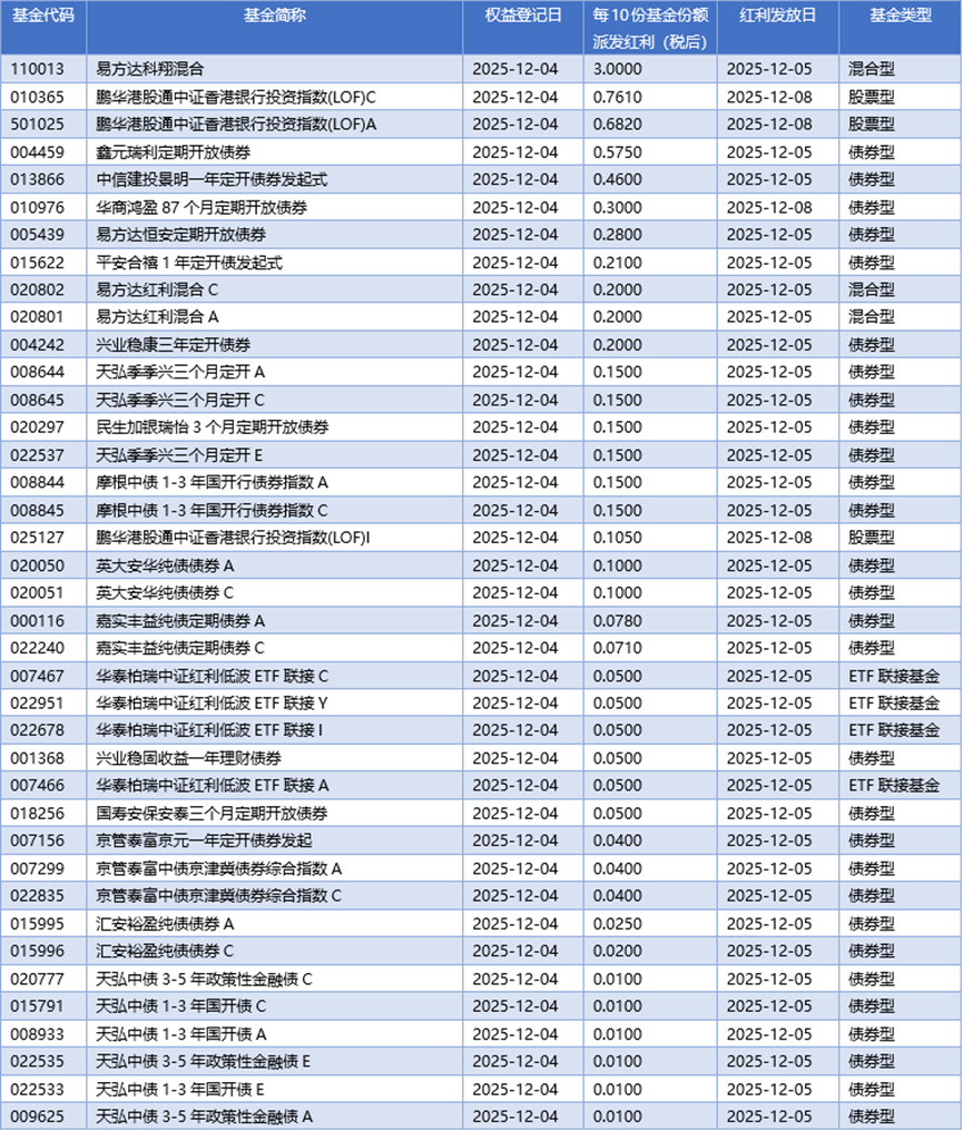 (1)12月04日新发基金共有5只,主要为股票型基金和混合型基金,其中平安发现价值混合A募集目标金额达30.00亿元;基金分红39只,多为债券型,派发红利最多的基金是易方达科翔混合型证券投资基金,每10份基金份额派发红利3.0000元。