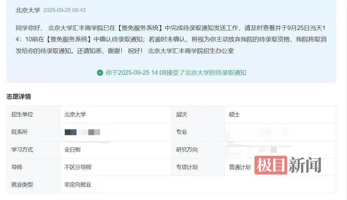 ,进入上财后的萱萱,一直保持着高中学习的状态。在大学前两年,萱萱的成绩基本保持在第一名。大三时,萱萱所在的专业和其他班级合并,自己的成绩也一直保持在前5%。就这样,萱萱拿到了研究生推免资格。,“其实在申请的时候,我觉得自己能申请上复旦大学或者上海交通大学就已经很好了,是最后的时候想着自己冲一把试试看。”2025年9月25日,萱萱收到了来自北京大学汇丰商学院拟录取的通知。,