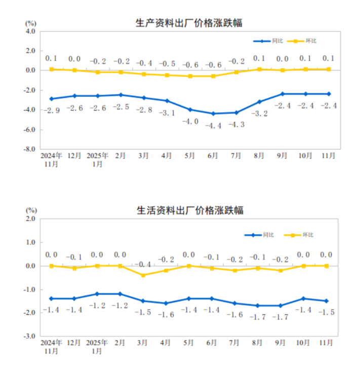 据国家统计局,2025年11月份,全国工业生产者出厂价格同比下降2.2%,工业生产者购进价格同比下降2.5%;工业生产者出厂价格和购进价格环比均上涨0.1%,涨幅均与上月相同。1—11月平均,工业生产者出厂价格比上年同期下降2.7%,工业生产者购进价格下降3.1%。