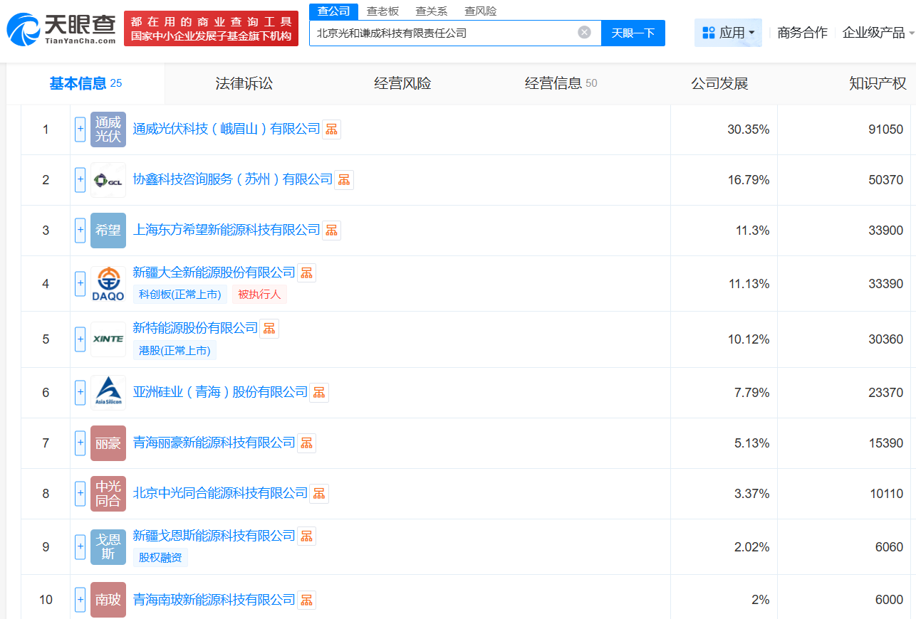 天眼查APP显示,北京光和谦成科技有限责任公司股权穿透图显示,通威股份控股孙公司通威光伏科技(峨眉山)有限公司持股30.35%,认缴注册资本为91050万元,协鑫科技子公司协鑫科技咨询服务(苏州)有限公司持股16.79%,东方希望、大全能源、新特能源和亚洲硅业持股比例分别为11.3%、11.13%、10.12%和7.79%。