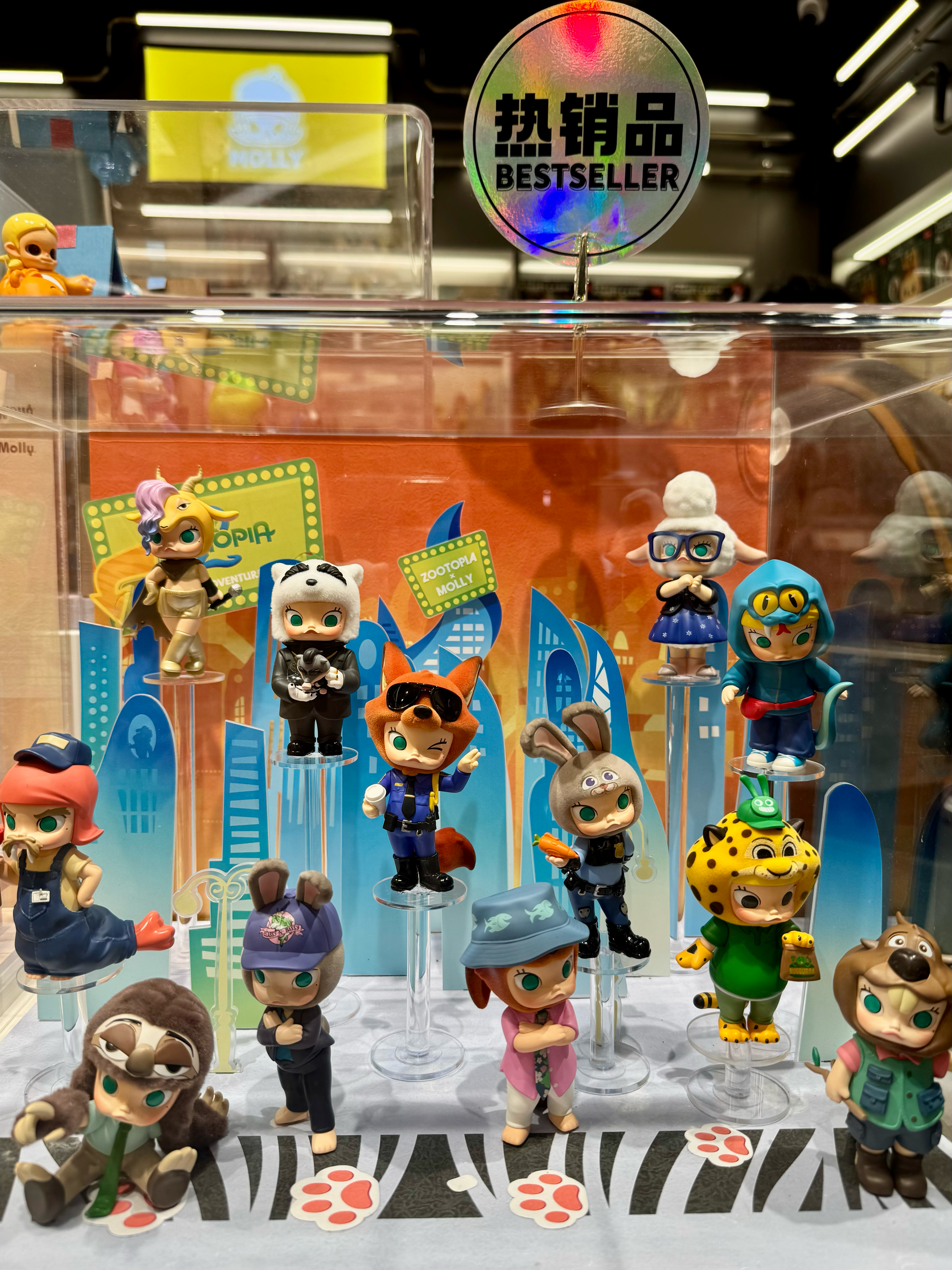 ,目前,猫眼专业版对《疯狂动物城2》的预测票房为39亿元,远高于最初25亿元的预测。有乐观的业内观点认为,影片热度将持续至跨年档。这种长效观影热度,也为其在潮玩市场的亮眼表现提供了保障。,70余品牌跨界联名,潮玩品类表现突出,据多家媒体报道,《疯狂动物城2》已与70余个品牌达成跨界合作,覆盖潮玩、餐饮、服饰、珠宝、汽车等多个核心消费品类。其中,几乎被年轻受众包揽的潮玩品类表现尤为突出。潮玩头部企业泡泡玛特推出了单只69元的“疯狂动物城疯狂再续”“MOLLY×疯狂动物城联名”两大盲盒系列,以及价值299元的“MOLLY疯狂动物城1/12可动人偶”——MOLLY作为泡泡玛特的经典IP,与《疯狂动物城2》的合作,既能助力前者实现“老IP翻新”,也提升了消费者对新品的认知度与购买意愿。,