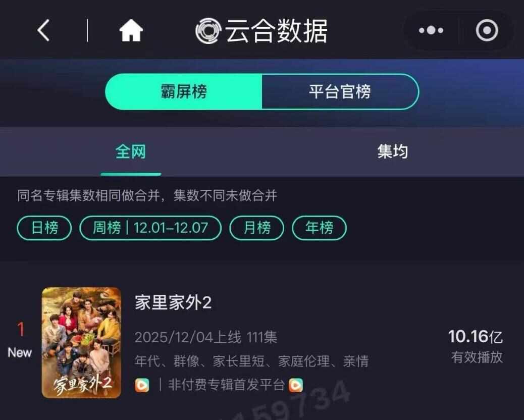 短剧行业再迎现象级爆款。,由听花岛出品的《家里家外2》自12月4日上线以来,迅速登顶热度榜单——云合数据仅三天就突破十亿播放,《家里家外2》成为2025年云合平台播放量破十亿速度最快的短剧。在红果平台,首日热度值即破亿,四天播放量突破十亿,各项数据持续攀升。,