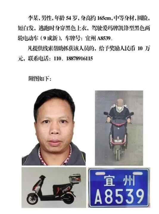 ,据媒体报道,当地警方发布悬赏通告,对提供线索帮助抓获人员的给予10万元。悬赏通告显示,嫌疑人李某,男性,逃跑时身穿黑色上衣,驾驶两轮电动车。,