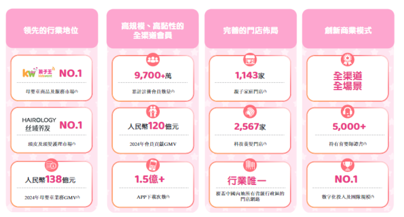孩子王由南京知名创投人汪建国于2009年创办,2021年10月在创业板上市。其在业内首创了“商品+服务+社交”的大店商业模式,业务覆盖母婴童商品销售、母婴服务、供应商服务、广告业务和平台服务等。据弗若斯特沙利文数据,2024年按GMV计算,孩子王在中国母婴童产品及服务市场位居第一,市场份额为0.3%。