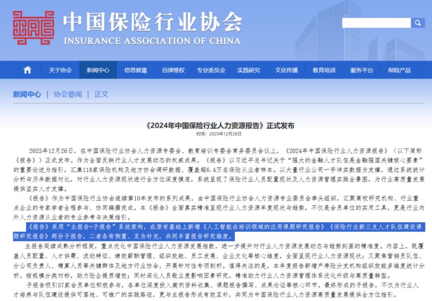 在高级管理层之下,保司员工年轻化同步进行。中国保险行业协会《2024年中国保险行业人力资源报告》显示,行业人力资源体系正加速向数字化、专业化重构,报告覆盖118家保险机构及超6.4万名从业者样本,新增《人工智能在培训领域的应用课题研究报告》《保险行业新三支人才队伍建设课题研究报告》,直指年轻人才培养与数字化能力提升的核心需求。