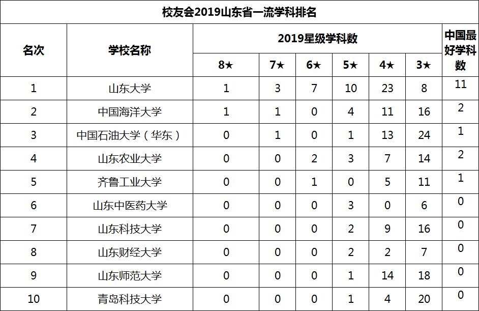 根据校友会发布的2019山东省一流学科排名可知,山东大学以“拥有1个八星学科,3个七星学科,7个六星学科”的水平遥遥领先第二名中国海洋大学。