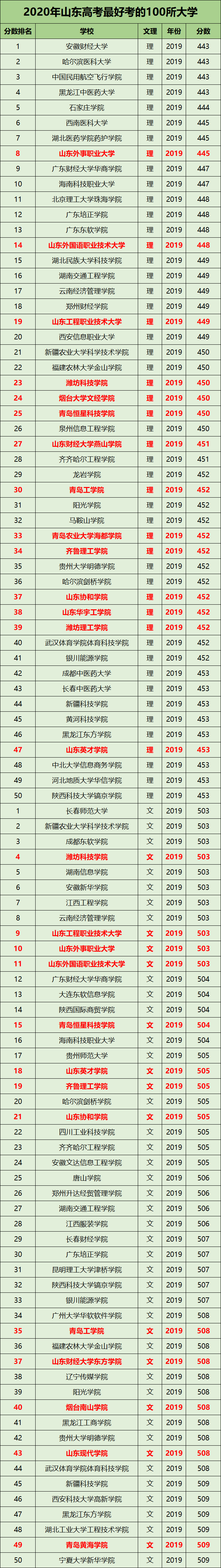 圆梦志愿根据国内各个高校2019年在山东省的录取情况,为同学们整理出了2020年最容易考上的100所本科大学名单。