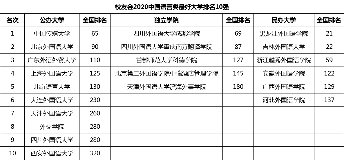 根据校友会发布的2020中国语言类最好大学排名可知,我国排名前十的外国语大学是:中国传媒大学、北京外国语大学、广东外语外贸大学、上海外国语大学、北京语言大学、大连外国语大学、天津外国语大学、外交学院、四川外国语大学、西安外国语大学。