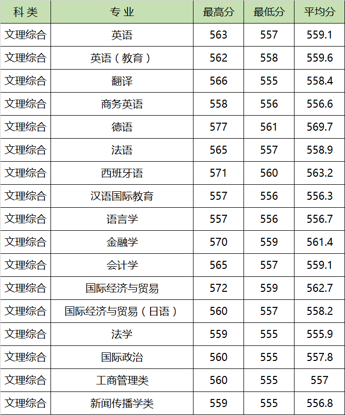上海外国语大学2019年在上海市收分最高的专业为德语,最高分为577分,最低分为561分;收分最低的专业为法学,最高分为559分,最低分为555分。