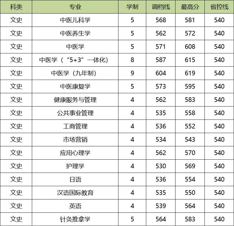 成都中医药大学2019年在四川收分最高的普通文科专业为中医学(九年制),最高分为619分,最低分为604分;收分最低的普通文科专业为护理学,最高分为569分,最低分为530分。