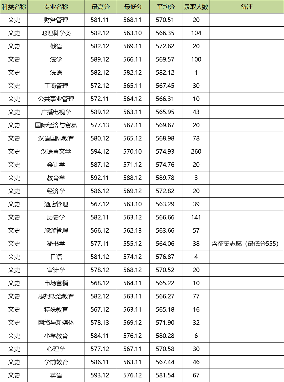 四川师范大学2019年在四川收分最高的普通文科专业为汉语言文学,最高分为594.12分,最低分为570.1分;收分最低的普通文科专业为秘书学,最高分为577.11分,最低分为555.12分。(含征集志愿)