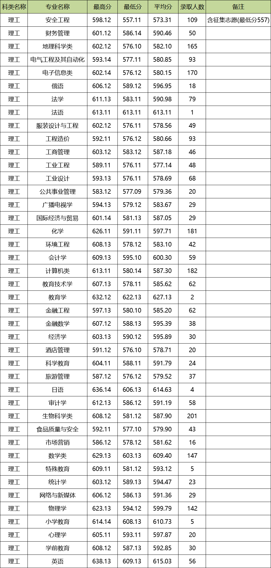 四川师范大学2019年在四川收分最高的普通理科专业为英语,最高分为638.13分,最低分为609.13分;收分最低的普通理科专业为安全工程,最高分为598.12分,最低分为557.11分。(含征集志愿)