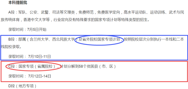 以2019年甘肃省录取时间为例可知,国家专项计划的录取都是在本科一批次录取之前完成。