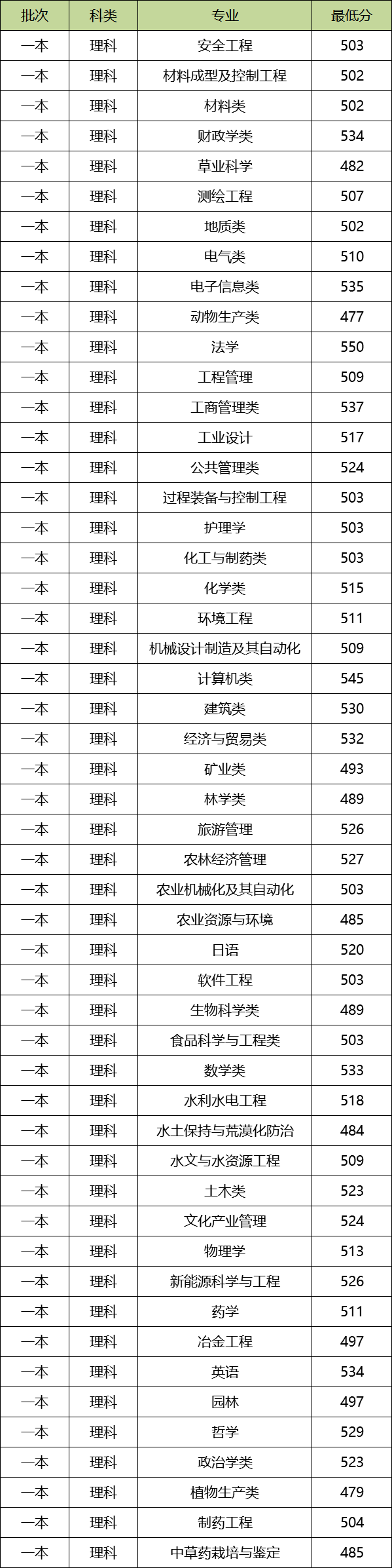 贵州大学本科一批2019年在贵州收分最低的普通理科专业为动物生产类,最低分为477分。