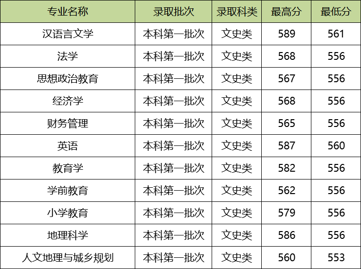 贵州师范大学本科一批2019年在贵州收分最高的普通文科专业为汉语言文学,最高分为589分,最低分为561分;收分最低的普通文科专业为人文地理与城乡规划,最高分为560分,最低分为553分。