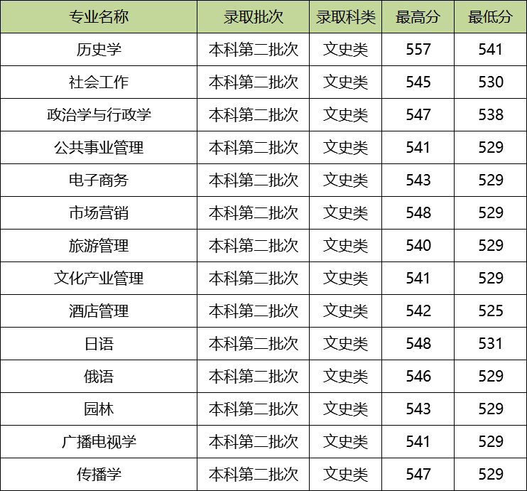 贵州师范大学本科二批2019年在贵州收分最高的普通文科专业为历史学,最高分为557分,最低分为541分;收分最低的普通文科专业为酒店管理,最高分为542分,最低分为525分。