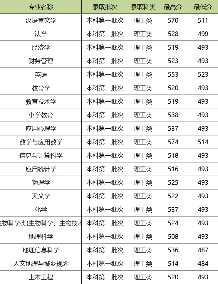 贵州师范大学本科一批2019年在贵州收分最高的普通理科专业为数学与应用数学,最高分为574分,最低分为514分;收分最低的普通理科专业为人文地理与城乡规划,最高分为514分,最低分为484分。