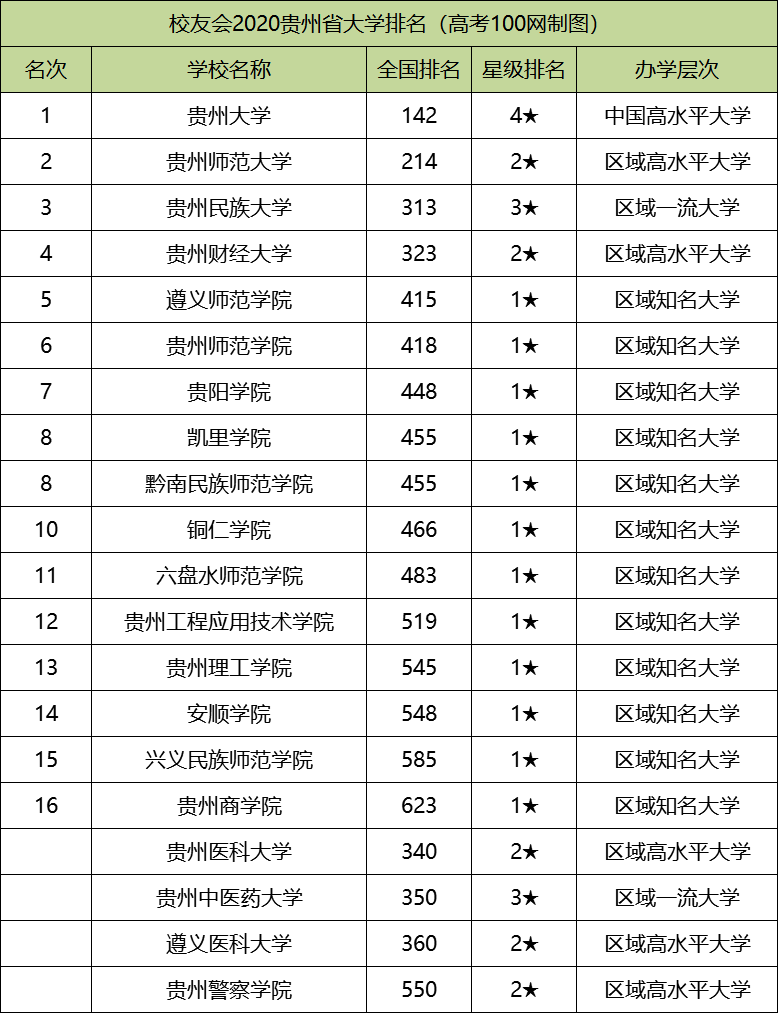 以下是贵州省2020年大学排名具体名单,供同学们查阅!