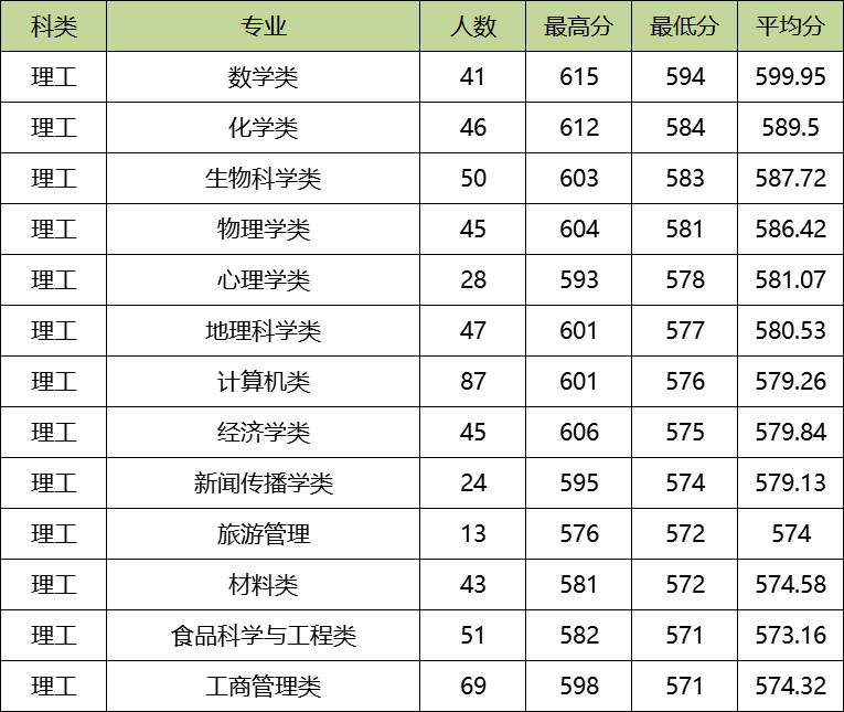 陕西师范大学2019年在陕西收分最高的普通理科专业为数学类,最高分为615分,最低分为594分;收分最低的普通理科专业为食品科学与工程类,最高分为582分,最低分为571分。