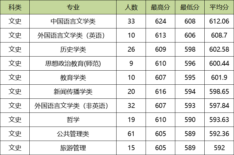 陕西师范大学2019年在陕西收分最高的普通文科专业为中国语言文学类,最高分为624分,最低分为608分;收分最低的普通文科专业为旅游管理,最高分为605分,最低分为589分。